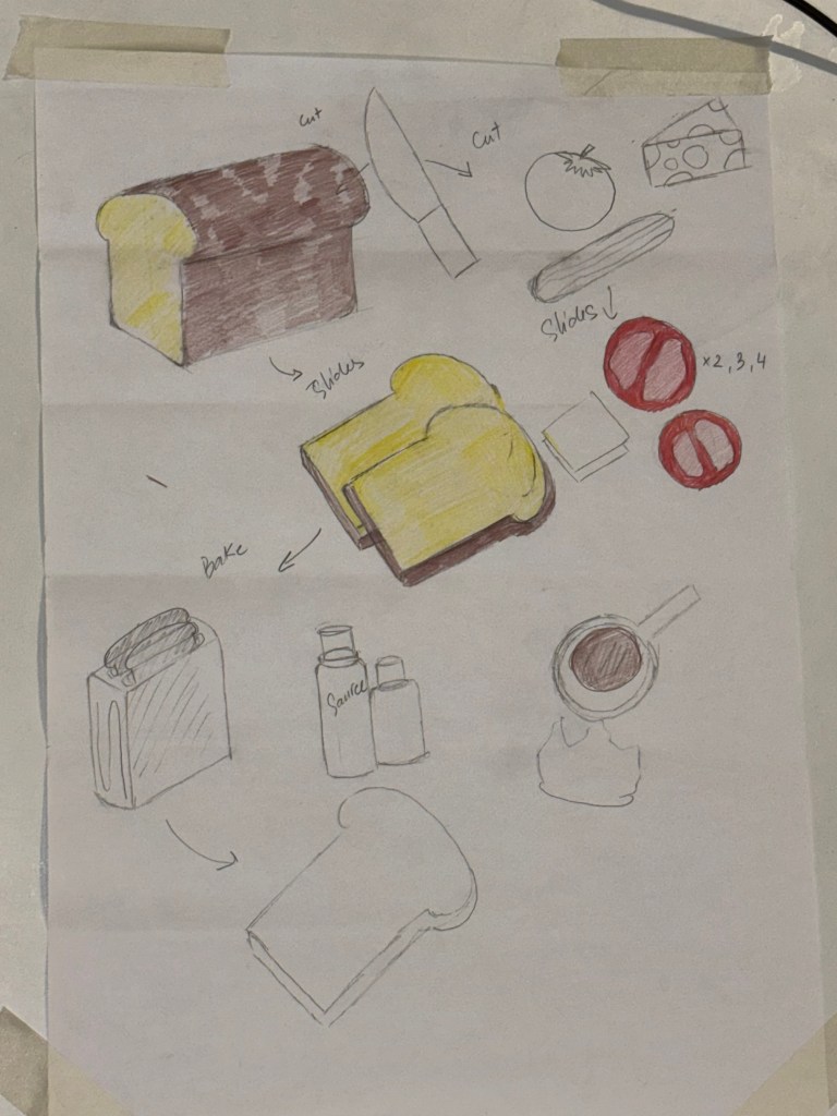 The second drawing is about the process of making in my own way. First of all, I chose to prepare all the ingredieants such as a loaf of sandwich, cucumber, tomato, cheese and a beef steak. Then, I cut all of the ingredients into slides. After that I toasted th bread before making sandwich. Plus, I added mayonnaise, chili sauce, put the beef steak into sandwiches and all of the vegetables I prepared.