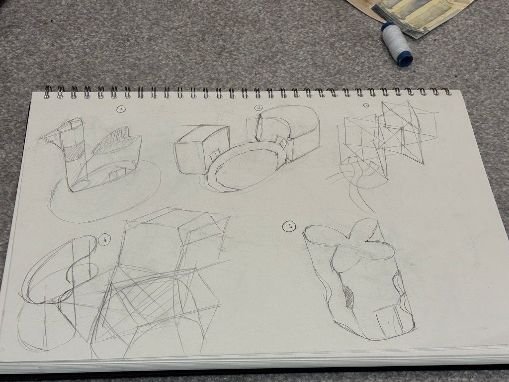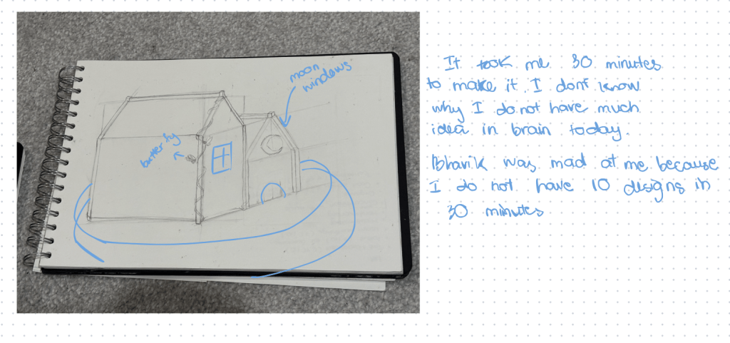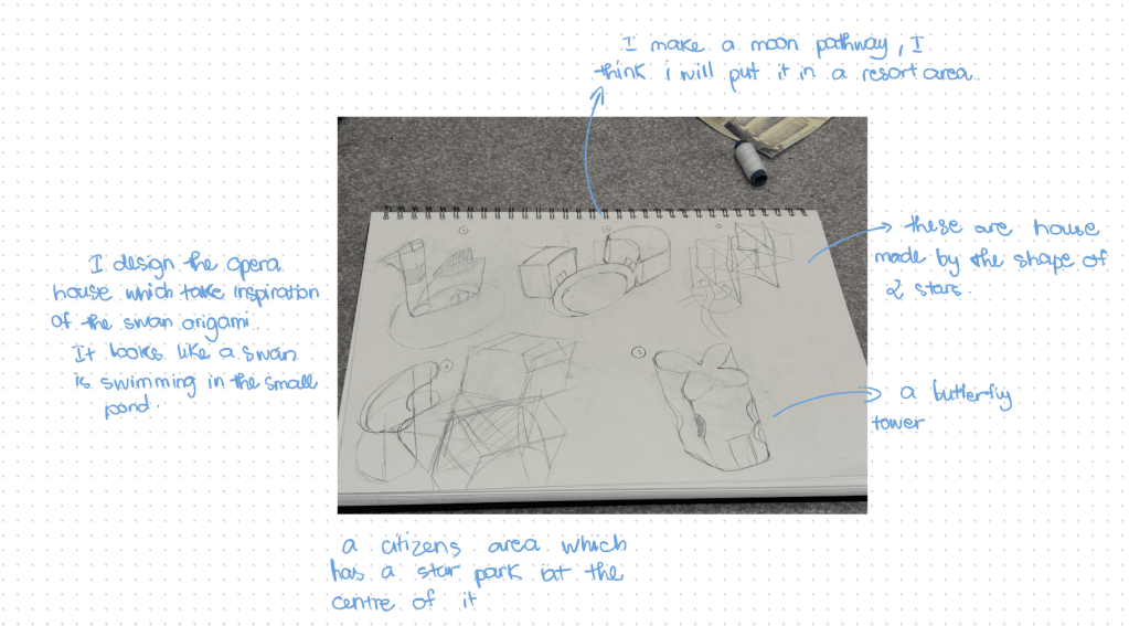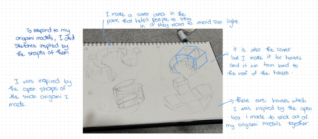 We did an activity that we have to respond to our origami models. Bhavik want us to have 10 sketches in 30 minutes. To be honest is really hard for me to do quickly sketches. Bhavik was really mad when I just had one sketch after he came back. I was mad myself as wel.