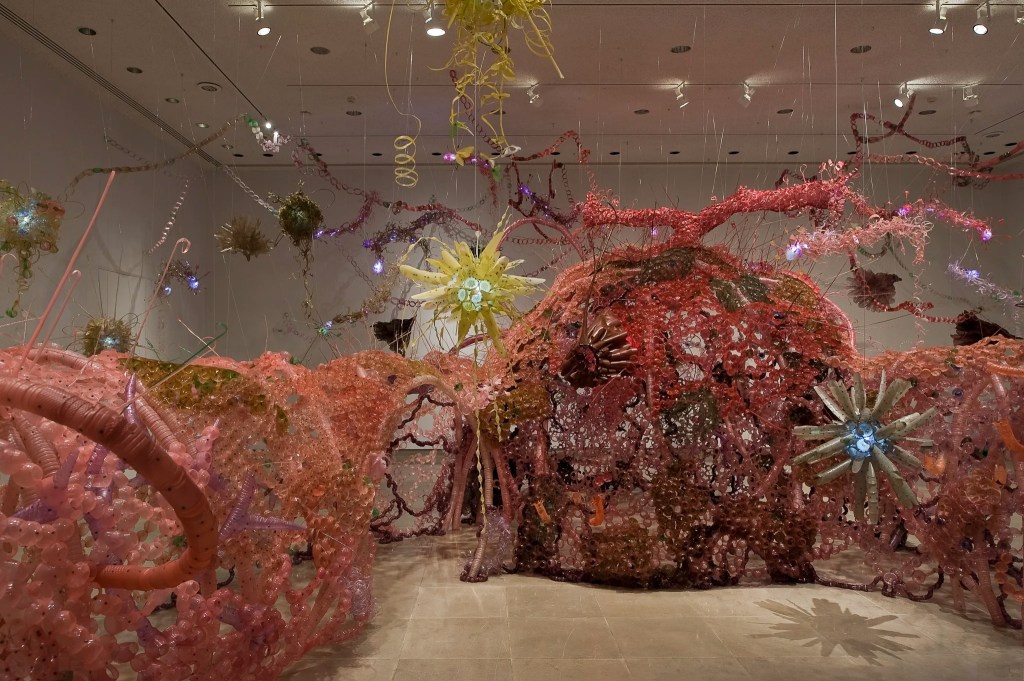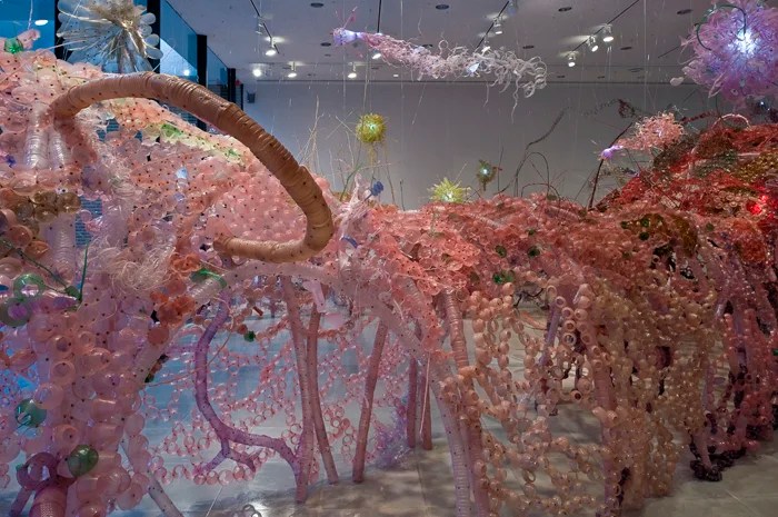 She collects tens of thousands of plastic bottles, cleans them, removes the labels, and roughly trims them. Then she uses heat guns, soldering irons, and specialized heat tools to heat the plastic surface. Under the influence of controlled temperature, the plastic becomes pliable and expands, allowing her to bend, twist, stretch, and 3D model them into complex organic forms. The heat helps the material’s surface create wavy textures that mimic coral reefs, fungal mycelium, or natural organisms. Smaller pieces are then heat-welded or riveted together to form multi-dimensional, suspended models. Robson’s works are not just single objects but often serve as micro-landscapes. They completely change the perception of the surrounding space, transforming an empty room into a multi-layered artificial “forest,” offering valuable inspiration for designing green spaces or functional areas. Her art takes a toxic and rough industrial material (household waste), using heat to break down its structure and reshape it into vibrant, abstract forms and colors. Many of her works also incorporate LED lighting systems to emphasize the interwoven layers of material.