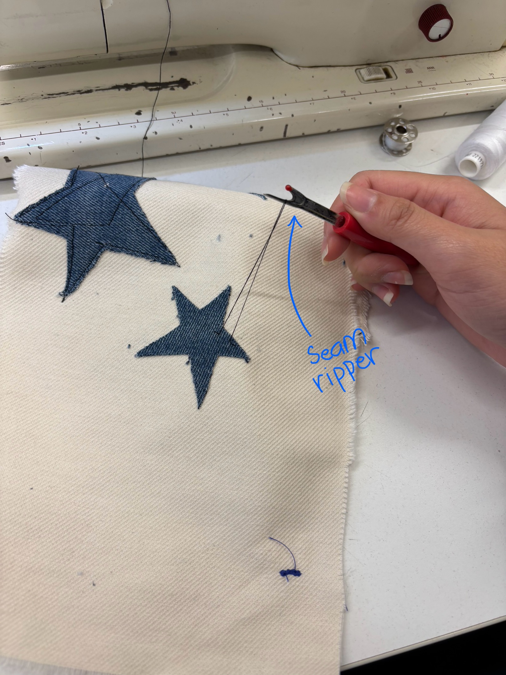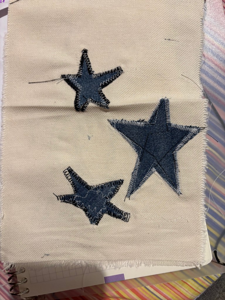 I used denim and cut out star patterns because it was from the Y2K style which is quite popular right now (There are many kpop groups that are using this style) and I’m impressed with it. Plus, I can remove any bad stitches or seams I don’t like with a seam ripper. I used different sewing patterns because I didn’t have a chance to try them the week before.