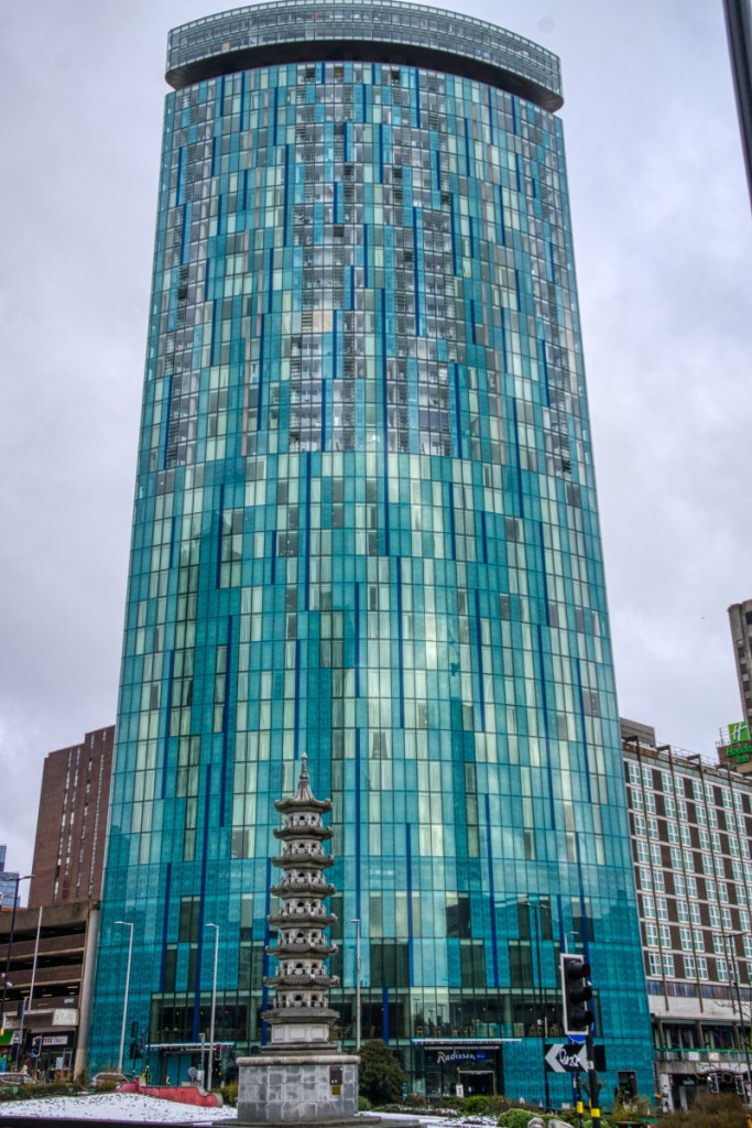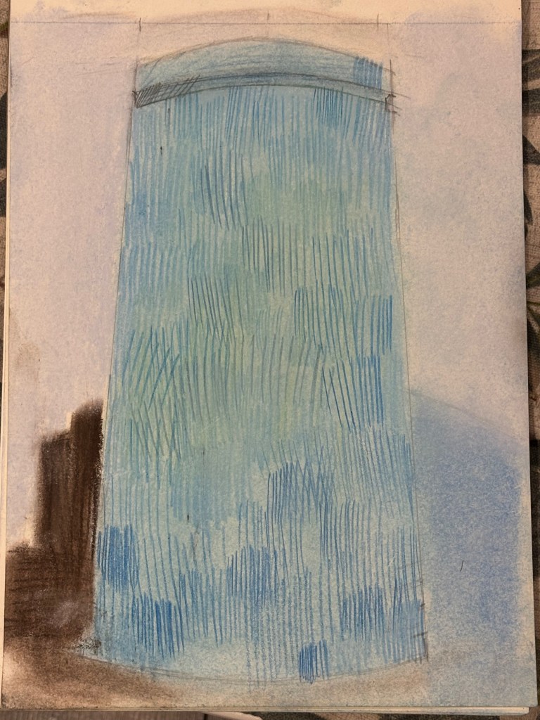 For this drawing, I chose Beetham Tower because I wanted to capture the elegance of modern architecture using only simple tools. I decided to simplify the surroundings and focus on the main building to make it stand out as the central feature of the composition. I used coloured pencils only and applied horizontal and cross-hatching lines to build tone and texture instead of blending.