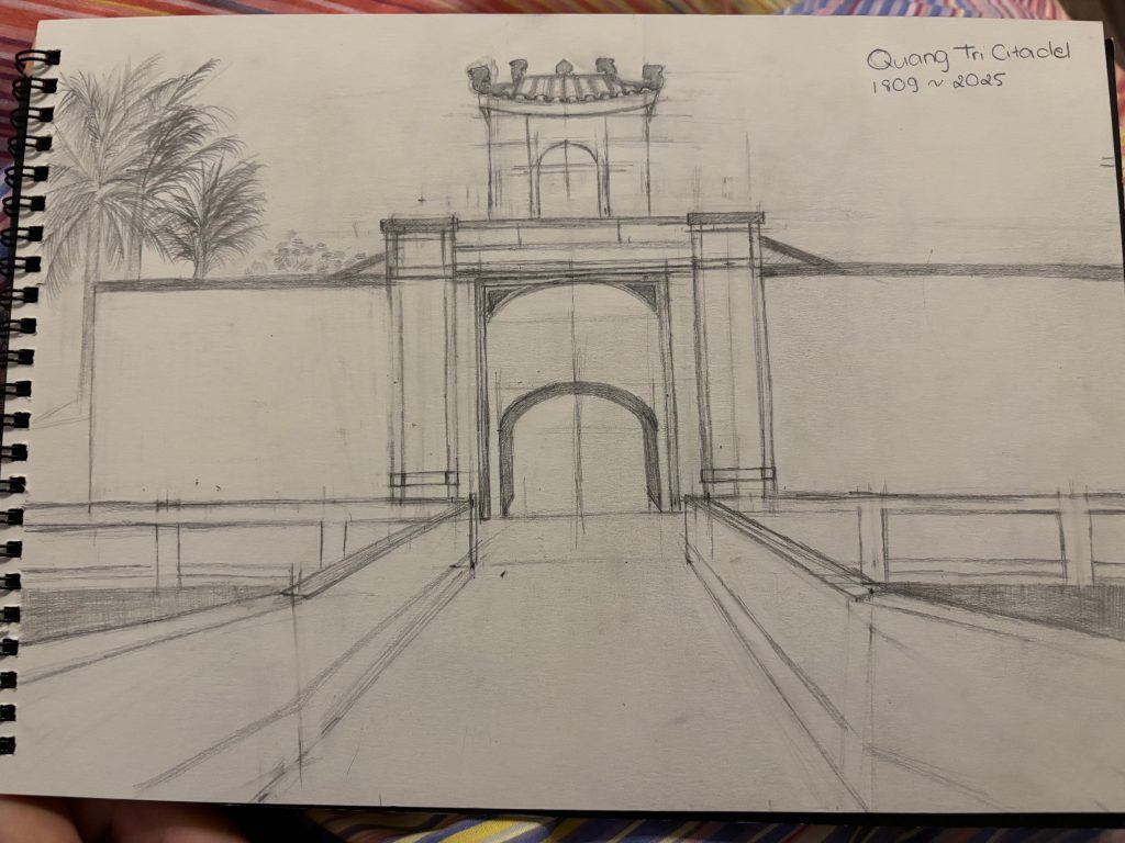 My inspiration came from Quang Tri Citadel, which was a witness to many historical events, especially the 81-day battle in 1972 (anti-American resistance war to) during the Vietnam War. The war demonstrated a resilient fighting spirit, contributing significantly to changing the situation of the war and paving the way for the Paris Agreement in 1973. What reminded me of this architecture was through the movie “Mưa Đỏ” (August 22, 2025), which recreated the historical context, heroic sacrifices and patriotism of the youth. The movie really made a strong impression on me, so I decided to redraw a part of the Citadel. Throughout the process, I chose to draw with only pencils to easily illustrate antiquity and longevity.