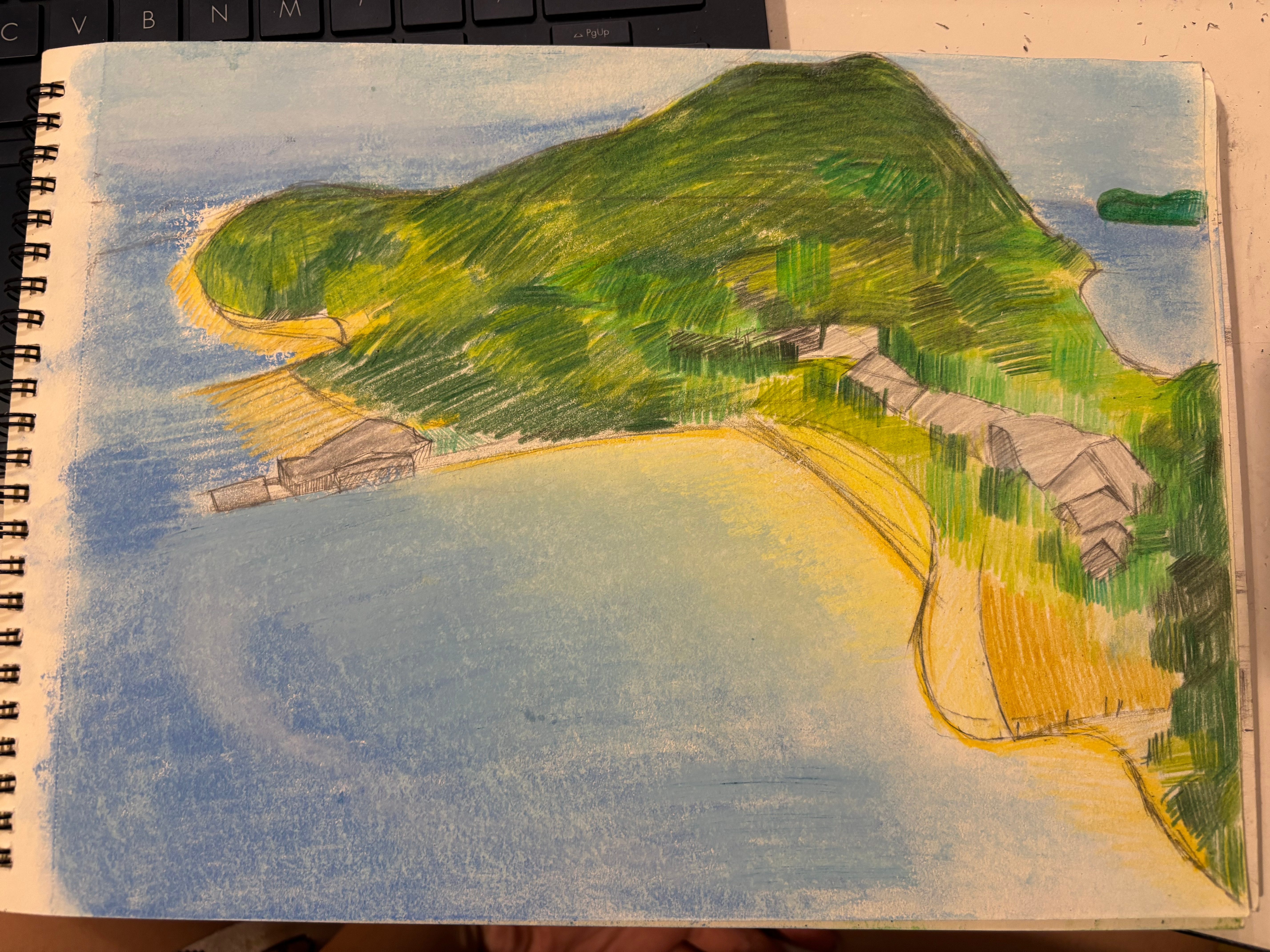 The second drawing is about Phu Quoc island, because it is one of the most beautiful and peaceful places in Vietnam. I was inspired by the island’s clear blue sea, golden sand, and the way sunlight reflects on the water. Every summer, my family chose this island to rest and enjoy the vacation. During the process, I experimented with color blending to create a realistic sea and sky. I used soft pastels to draw the large part and colored pencils to draw the detail. The most challenging part was making everything look natural, show the beauty of the island.