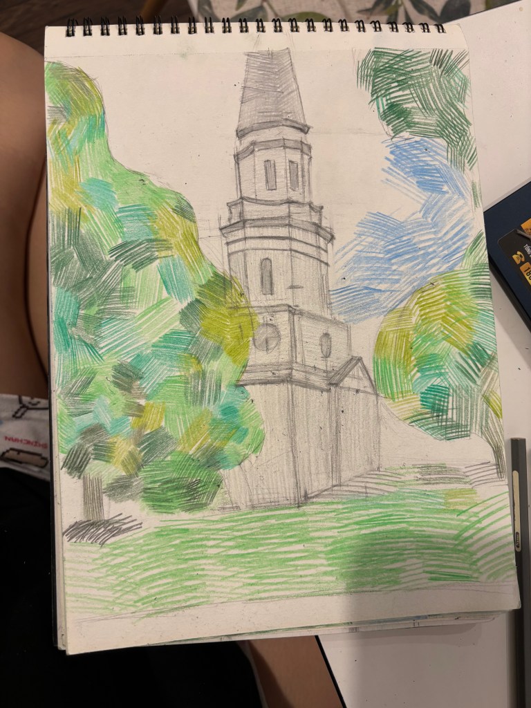 For this drawing, I chose St Paul’s Square because I have always been fascinated by classical architecture, especially old churches with historical and elegant designs. The church in the middle of the square inspired me with its calm atmosphere and detailed structure. I wanted to capture the beauty of the building and the peaceful feeling it creates. This time I worked only with coloured pencils and I applied horizontal and cross-hatching lines to build up tones.