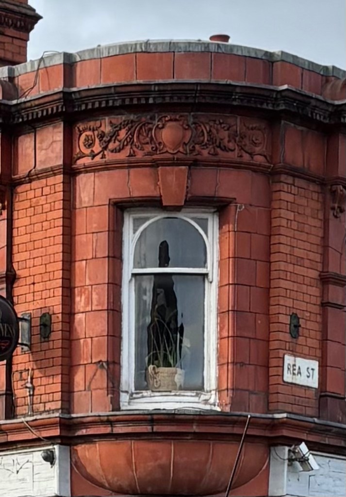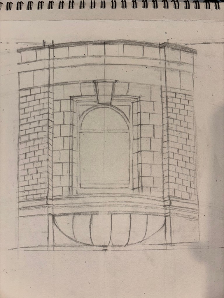 I knew that painting bricks and stones wouldn’t work without first determining the correct perspective and curvature of the window frame and base. I spent a lot of time on alignment and measuring to be able to paint the brick texture realistically.
