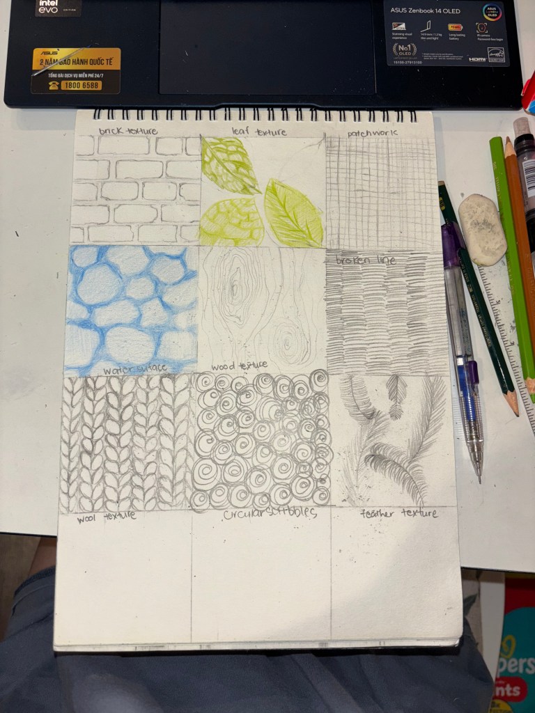 This is a swatch page I made in class, i learned abbbout the texture og various different materials and many way to drawn.