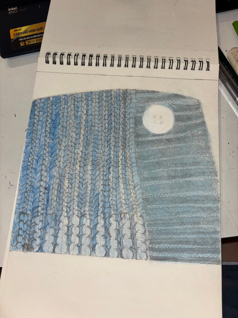 The knitted fabric study was a dificult class in rendering softness and volume through repetitive pattern. I discovered that realistic fabric texture relies not just on drawing the loops, but on carefully shading the ridges and troughs of the knit to suggest the way light hits the fibers.