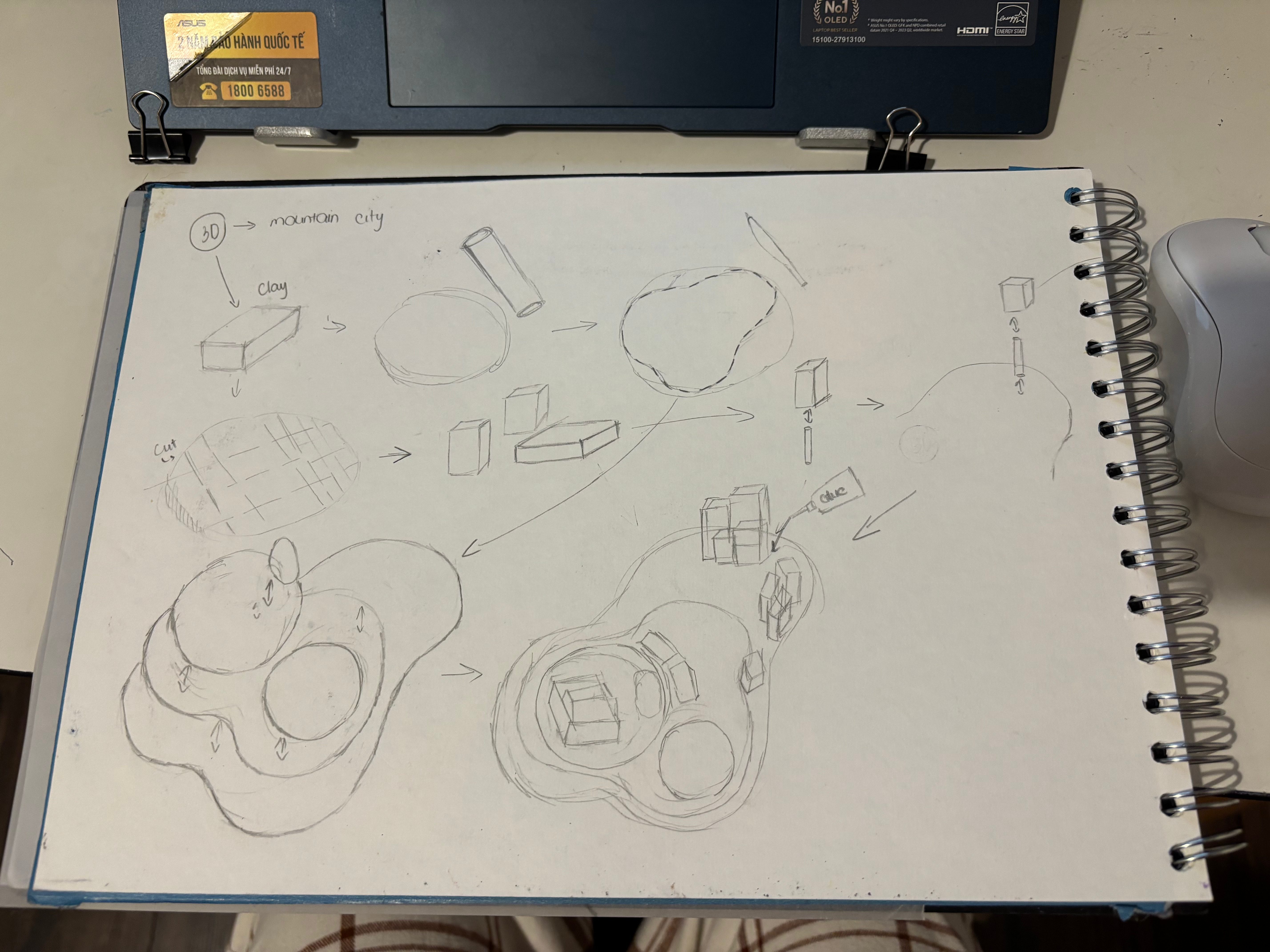 I planned to make mountain city by clay, It have 3 layers to depict stratification of the mountain. Because of having some problem with connecting 2 different parts of clay together, this model I did with more sticks and glue the loose parts.