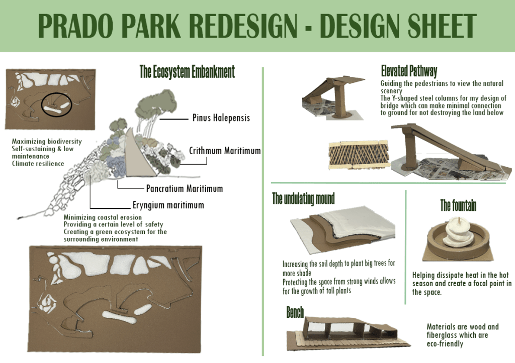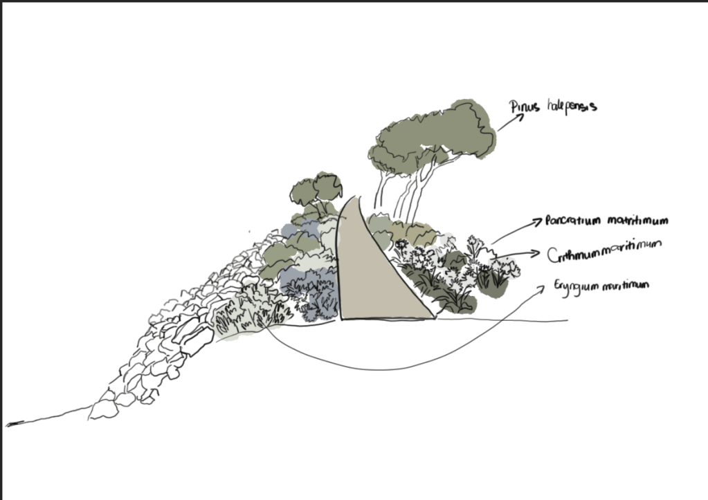 Based on the supporting research, I design the ecosystem in the breakwater section which also has 4 layers of plants. For the structural layer, I use Pinus Halepensis which has drought tolerance and creating shade reduces the urban heat island effect (Forests 2020). This support for the climatic characteristics of Prado Beach are described above. I chose Pancratium Maritimum for the seasonal theme plant because it is one of native plants in France and capable of withstanding soil salinity and sea winds (Horticultura 2025). For ground-covering plants, I want to choose a plant which can adapt to nestle among the cliffs and coastal embankments exposed to strong salty winds, and survival strategies in nutrient-poor soil conditions is Crithmum Maritimum (de la Riva et al., 2016). Then to fill the gaps between the ground cover and the structural layer, interweaving with other species to create a cohesive, naturally lush plant community, I choose Eryngium maritimum (Cortés-Fernández et al., 2022).