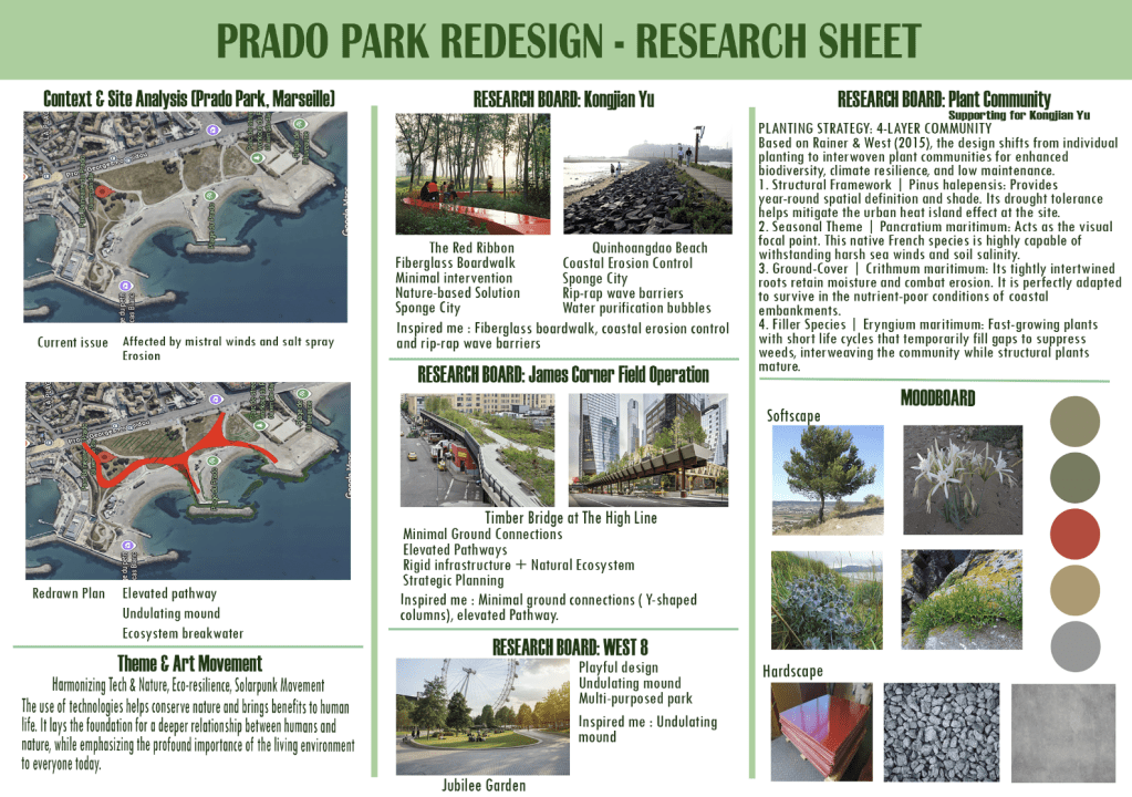 At the beginning of the journey, I was struggling with doing deep research and critical analysing. Reading research from online resources is easy but finding academic resources is difficult because not all of the resources I need are available in the university library. To improve it, I spent more time on finding similar research of what I needed and additionally I do primary research to gain real-life experience when I can see how people use a park. Sketching down the landscape and ideas helps me a lot in generating my idea to other people, in parallel improving my sketching skills. Plus, doing enough research is also important when I keep reading more research but not document about it and the more I read the more ideas I have even though have enough time for this. If I did this again, I would document everything first before turning into new research because it allows me to spend time more efficiently.