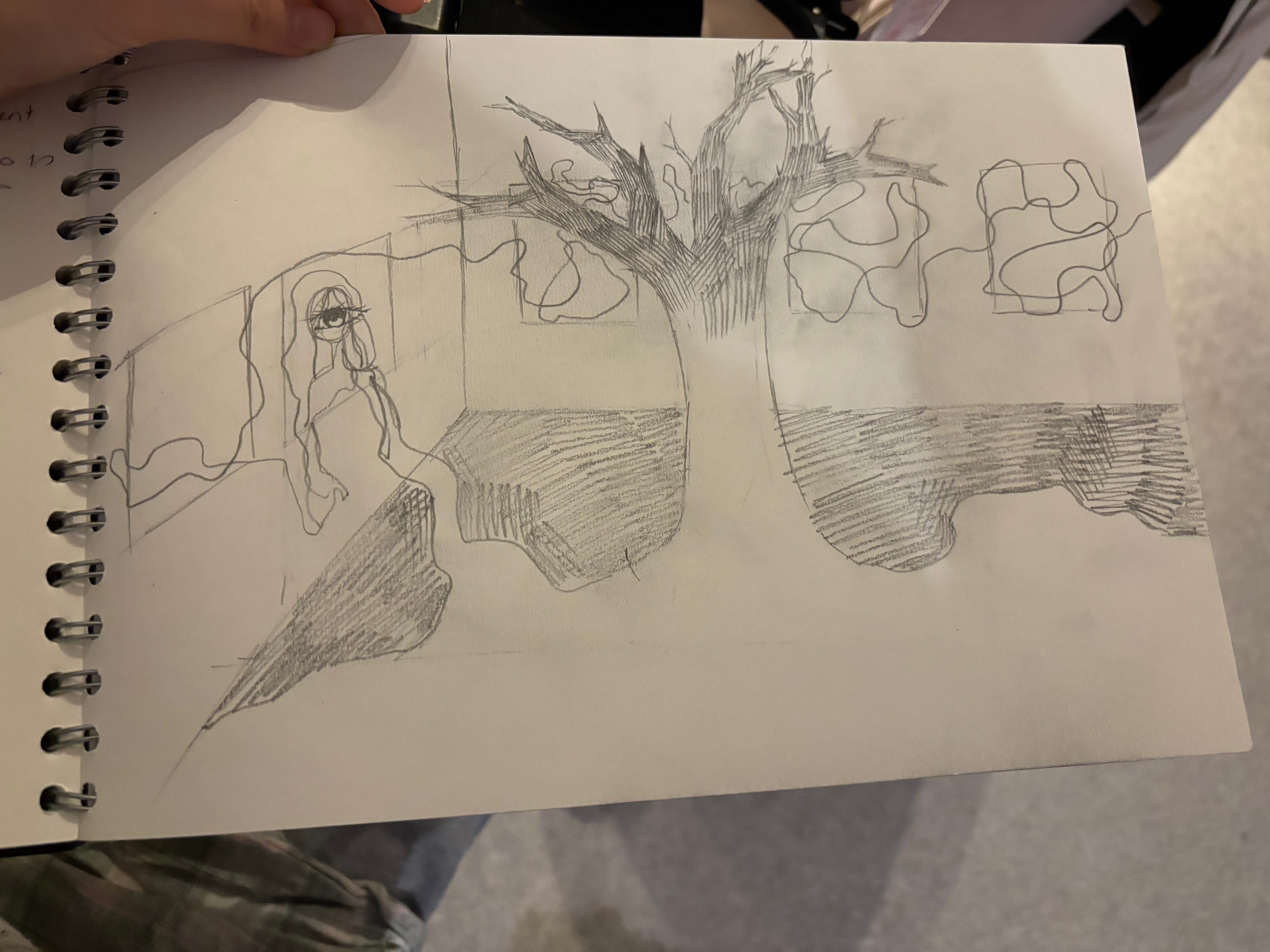 Because the previous painting already represented a different perspective, the painting I created depicts a box-like space where trees and roots emerge from nowhere, locking all the doorways. The eye gazes into this confinement, searching for something, as if portraying the human mind trapped between reality and illusion.