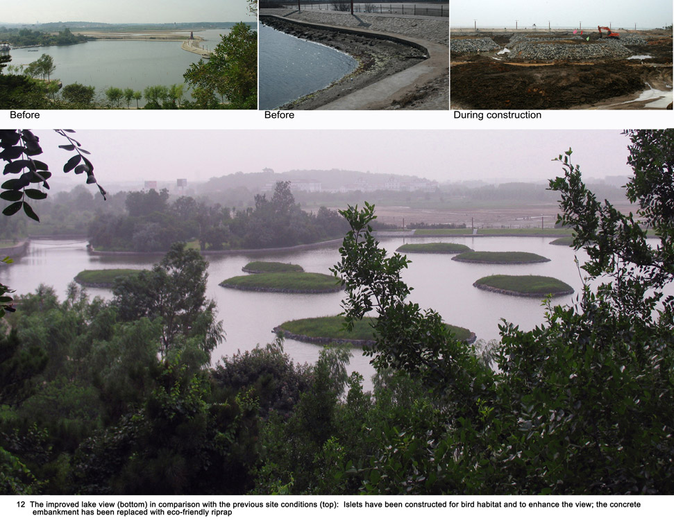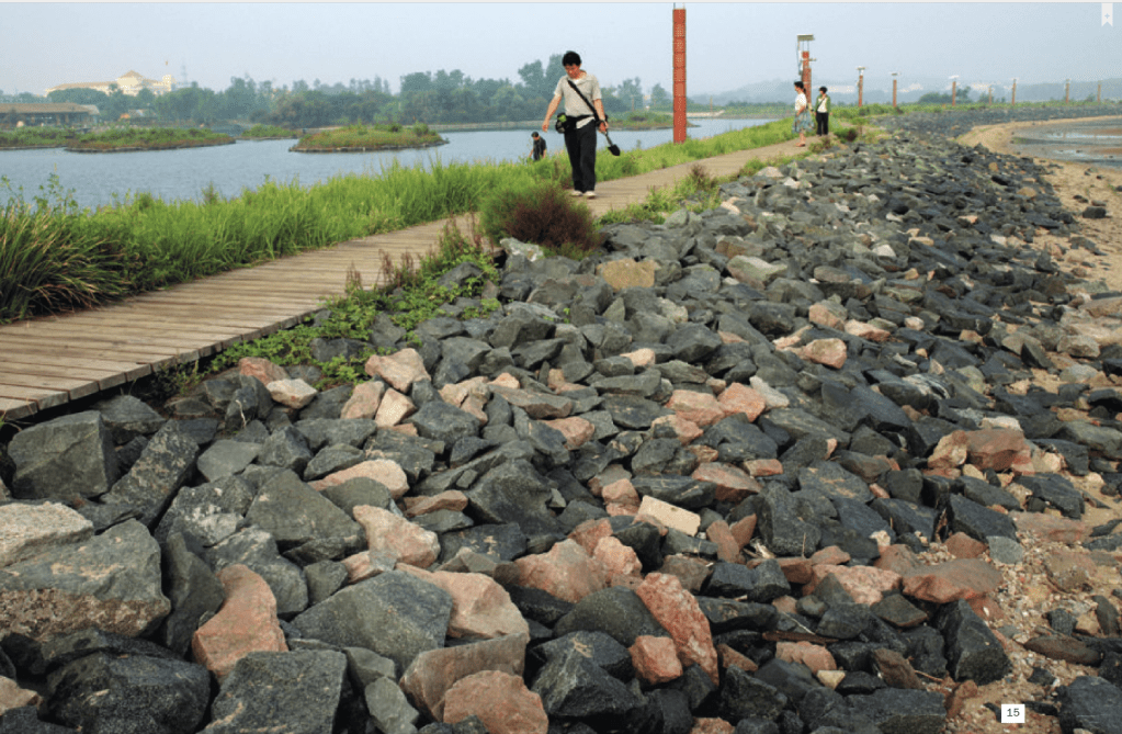 Turenscape utilized the construction debris to create bubble-shaped holes as a solution for managing rainwater. The bubble shaped water both retains natural water and creates habitats for the plant which also creates an environment for many birds to recover. This is a highly effective solution that does not require a high investment but still reserves the ecosystem which was a degraded place.