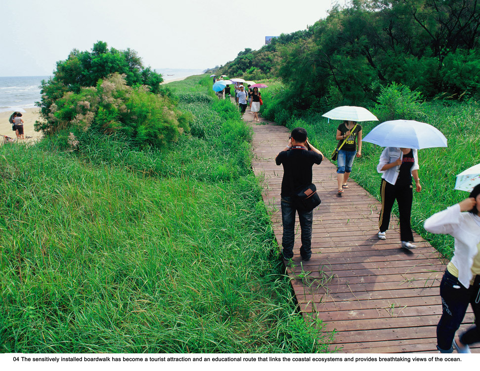 There is the same combination between hardscape and softscape material as The Red Ribbon park, using fiberglass boardwalk for people which wind along the shoreline of the beach. This helps visitors to experience the diverse plant communities surrounding. The walkway also serves as a soil structure which protects erosion coastline that was affected by sea winds and waves. The blend of softscape and hardscape created a contrast between the sturdiness of the boardwalk and the softness of vegetation. They design the wooden circulation pathways to raise off the sand, prevent people from trampling on the preserved dunes and also guide visitors into the naturally coastal landscape.