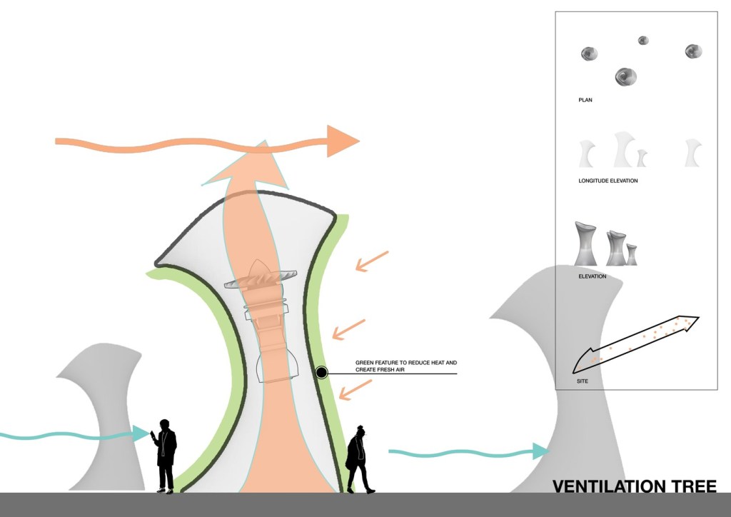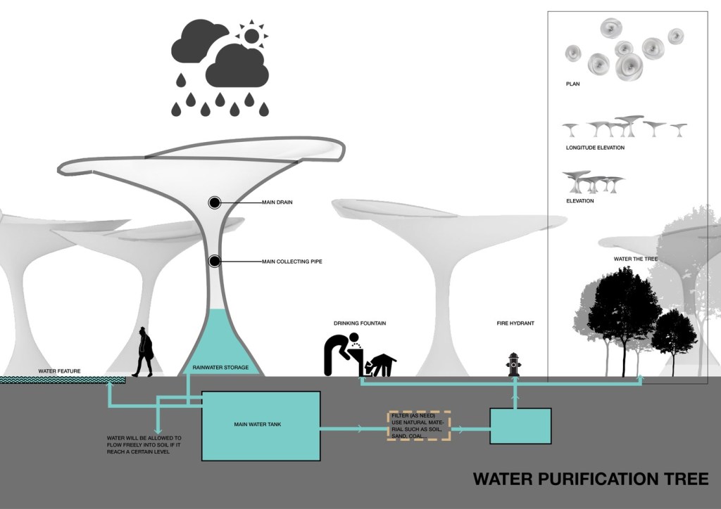 The project is notable for its artificial trees such as ventilation trees, water purification trees and solar trees which have shapes as reverse funnels, big mushrooms or umbrellas. They are designed to integrate with modern materials, integrated solar panels and waste/water collection systems (Harrouk, 2019).