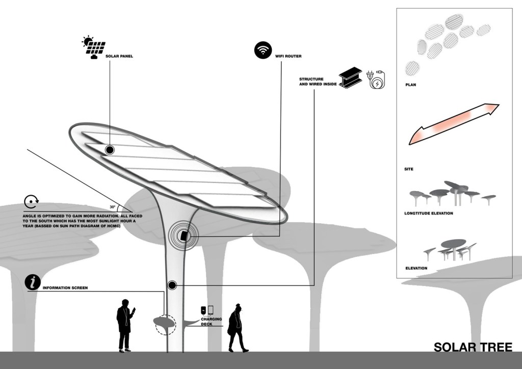 The project showed the harmonious connection of both natural and artificial trees, when natural trees and ventilation trees create fresh air and reduce heat for people in hot weather of Vietnam, purification trees and solar trees collect the natural energy to serve for visitors. The LAVA team and Aspect studio designed pathways, lawns, and water features all utilize organic curves, continuously winding and intertwining without sharp edges. This creates a soft feature specially contrast with the buildings surrounding which are high and box-shape and grid-like road network surrounding Ben Thanh Market. The park will play a role as a green lung in the heart of Ho Chi Minh city for energy production and environmental cleanup. Functional optimization is a success point of this project because they utilized the climatic characteristics of Vietnam, simultaneously solving the heat problem of Vietnam climate for people.