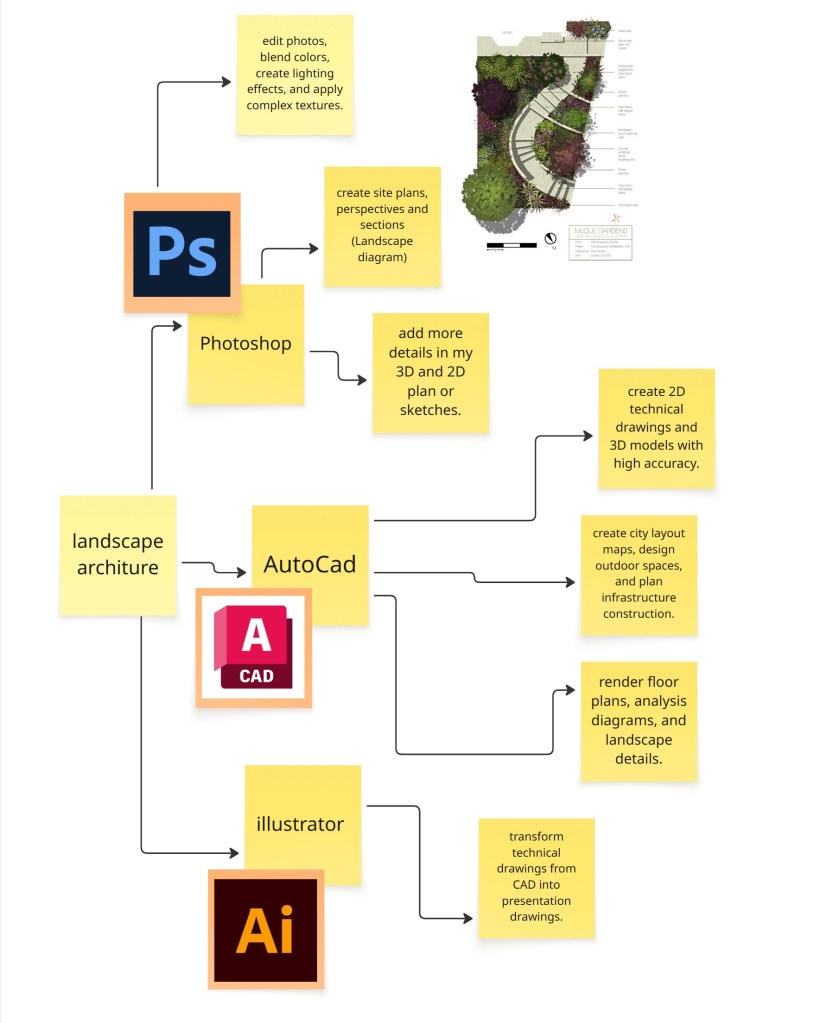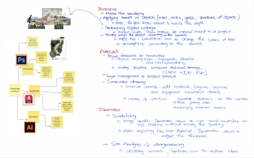 For landscape architecture, Photoshop, AutoCad and illustrators are necessary for me. AutoCAD is an important software that I want to learn this semester. It’s a necessary skill for an architect who wants to work on projects with precise and realistic measurements. Real-world landscape architecture projects often have a scale of 1:1000 or 1:1:1000. As the range of scales expands, architects will observe an increasing number of factors to consider: the physical and psychological interaction between humans and the physical environment. This means that knowing how to use Autocad is necessary for landscape architecture. Adobe Photoshop is the primary tool for visual persuasion and emotional storytelling. In university programs, where grading criteria emphasize visual communication, Photoshop is indispensable. It allows students to overcome the rigid limitations of CAD by incorporating elements of texture, light, shadow, and biological complexity to shape the mood of a landscape. For students with backgrounds in traditional art or collage, Photoshop is the digital version of the canvas, enabling the creation of spaces that can sell to clients. Recruitment data from leading companies like ASPECT Studios or LAVA consistently lists advanced digital rendering skills as a prerequisite. They not only just require technical drawings but they also require emotionally rich images that can win design competitions. Illustrator is the standard vector graphics software for creating diagrams that simplify complex systems into easily readable graphics. Furthermore, it is the industry standard for compiling portfolios and presentations. A student portfolio is their passport to employment; creating crisp, high-resolution layouts that integrate text, CAD drawings, and Photoshop rendered images is impossible without Illustrator.