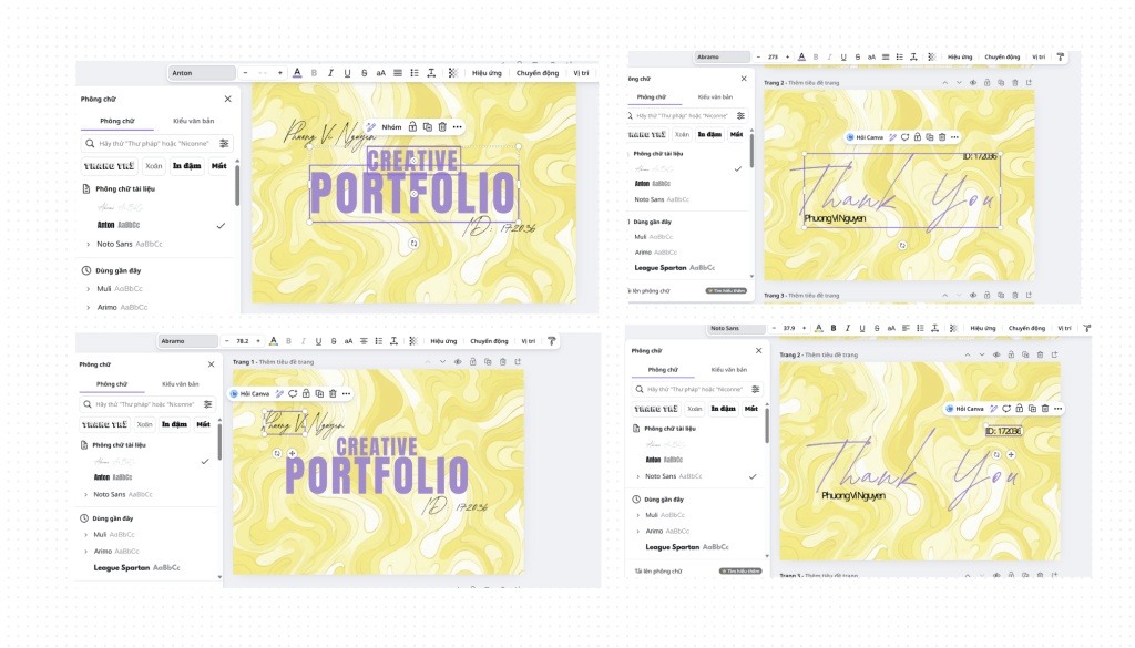 For these pages, I used Canva to edit because Canva has some fonts that Photoshop and Indesign donot have. I used Anton for title “CREATIVE PORTFOLIO”; Abramo for “Phuong Vi Nguyen” (my name), “ID: 172036″(my BCUIC id) in the cover and “Thank You”; Noto Sans for my name and my BCUIC id in the Thank You page.