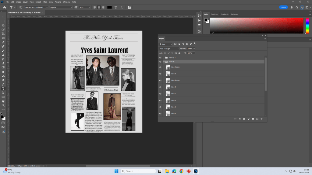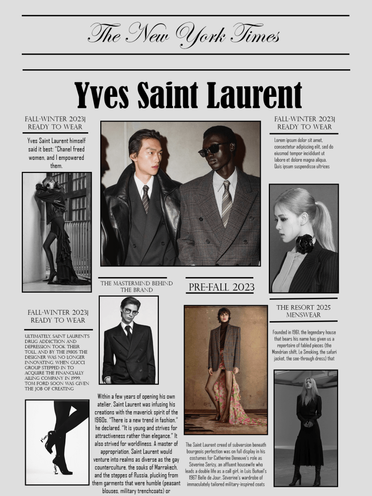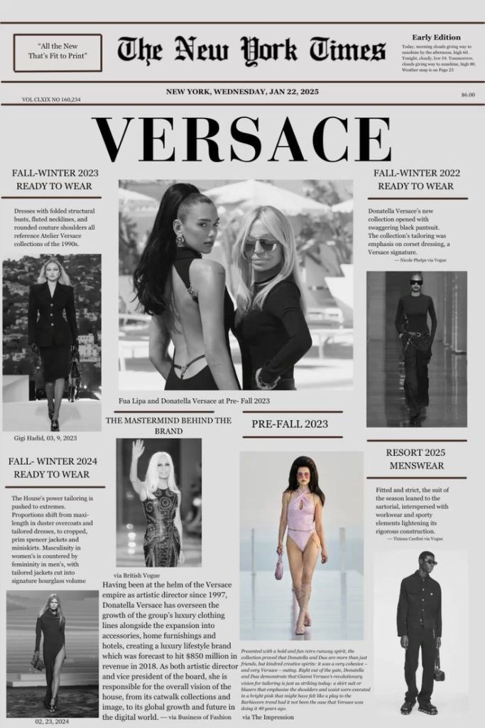 The original is the New York Times and Versace is the title which I do YSL based on. I created 7 rectangles relied on the original, then I uploaded 7 images corresponding to the rectangles and used clipping mask tool(The contents of the upper layer are visible only within the pixels of the lower layer). After that, I created many texts with different contents from the original to illustrate the contents of news.