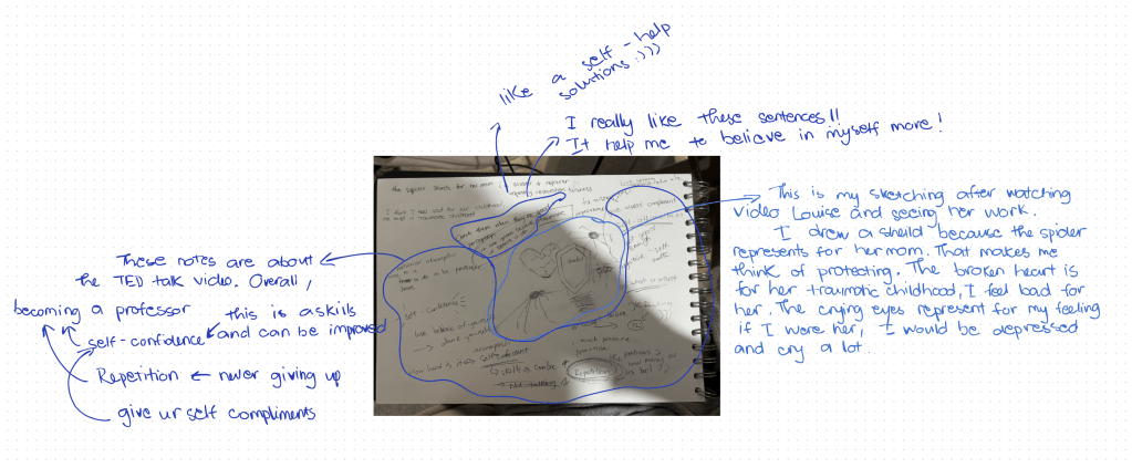 For Louise, I feel sad for her childhood. She has a traumatic child which her mother passed away when she was 22, and her father was unfaithful, she had a fear of abandonment. For, childhood is the fundamental foundation upon which a person’s character and core values are built. If I were her, I could not overcome that and even kill myself, I could collapse and lock myself away from the world and everything around me. For her artwork, the spider represents her mother, a mother who is both a protector and a repairer, especially I think it showed her fear of her childhood. Bourgeois was inspired by trauma, memory, family relationships, and the unconscious mind. These themes are universal. Many artists find inspiration in exploring personal pain, loss, and the complexity of human connections. This makes me feel that exploring pain helps to reveal personal emotions and forms the basis of who I am today.