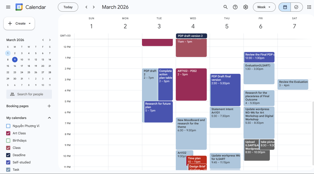 One of the difficult parts is time management. My work-life balance in the previous weeks was unhealthy. For example, I stayed up for three nights trying to do as much work as possible. It took a toll on my overall health and also on my ability to concentrate. I put too much pressure on myself trying to work. It overwhelmed me and drained my energy in the following days, making it impossible for me to continue working. To address this issue, I set higher priority tasks to complete before the deadline. I also scheduled breaks during long work sessions to avoid exhausting myself. Everything I did was organized using Google Calendar. This offers many benefits. It allows me to maintain a high average energy level on school days so I can concentrate better, and to recharge properly and adequately on days off. It helps me distribute my work evenly across the days and avoid becoming overwhelmed quickly. Besides, maintaining it as a habit is difficult. It takes a long time to form a habit, but since my ultimate goal is to improve my time management skills, I put more effort into it.