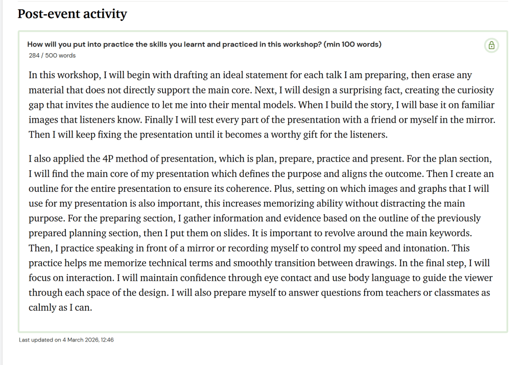 I prepare my presentation by using Gradute+ : Presentation skills session and using 4P method.